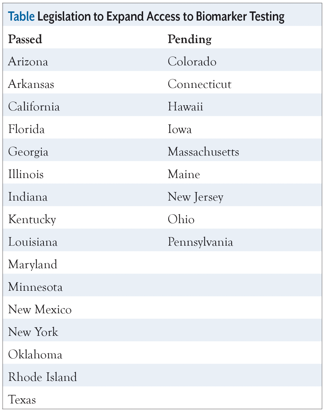 So far, legislation to expand coverage of biomarker testing has passed in 16 states, and bills are moving through the legislative process in 9 states (Table).