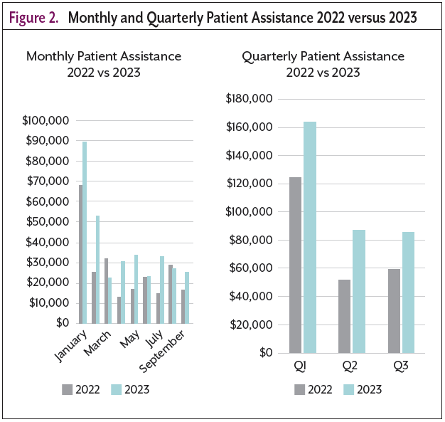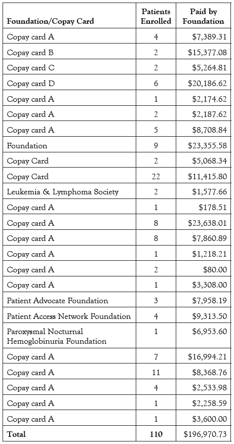 - Total number of patients receiving financial assistance: 110; financial value, including copay cards and foundation support, $196,970