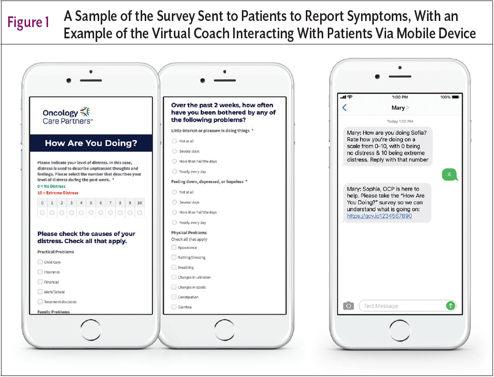A 91-year-old female patient with stage IV breast cancer metastatic to the bone, on hormonal therapy, and residing in an assisted living apartment was recently seen in clinic by her oncologist. Based on her clinical profile and risk characteristics, her oncologist completed a referral to the patient-centric oncology navigation program that was supporting the practice. After her appointment, a virtual survey was sent to her mobile phone. She responded to the survey after clinic operating hours with responses that warranted immediate escalation to the virtual nurse. Her responses revealed that she was suffering from low levels of nausea, poor appetite, and weakness. The virtual nurse called the patient to perform a telephonic assessment in real time and determined that the patient was very weak and anxious. The patient was unsure how to manage her symptoms and was afraid of falling. Although she did have a walker, she told the nurse that she had been staying in bed because she was uncomfortable from the nausea, adding to her weakness. She reported loss of appetite due to nausea and discomfort, which further exacerbated her weakness. She voiced concerns about not yet having received physical therapy as prescribed by her primary care provider. She verbalized feelings of uncertainty and worry.