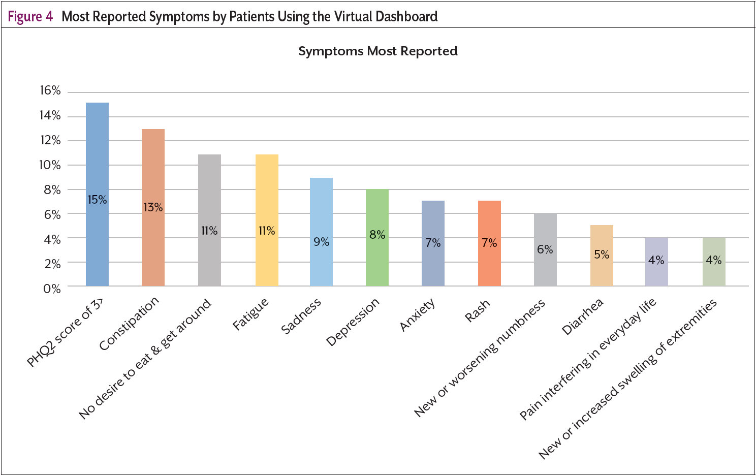 The most common self-reported symptoms on the survey as shown in Figure 4, are depression or sadness, constipation, fatigue, and lack of the desire to eat. Many of these were not reported in clinical visits with the on-site provider. These symptoms are crucial for early identification and intervention to aid in providing care when needed and in keeping patients out of the hospital. Intervention and resolution of these symptoms also keeps patients healthy enough to continue keeping their oncology appointments and adhering to treatment plans. Timely access to care at home made possible by coupling high-touch technology with a human-centric approach is not only effective but is also changing the landscape of cancer care navigation. The use of AI has allowed us the ability to combine machine intelligence with the critical thinking and compassion of human experts resulting in concise and timely interventions and an improved patient experience.4