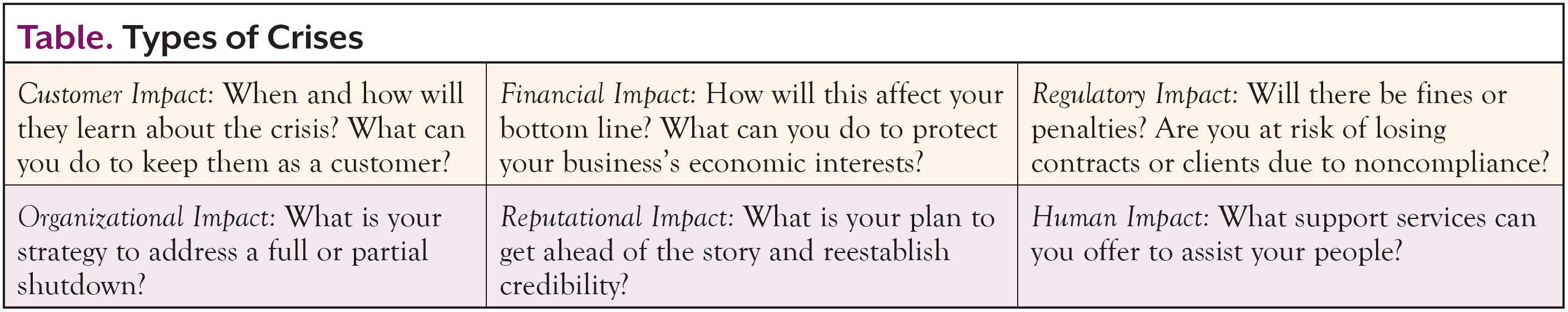 Crises commonly impact organizations in 6 ways: customer relations, finances, regulatory compliance, operations, reputation, and human well-being.