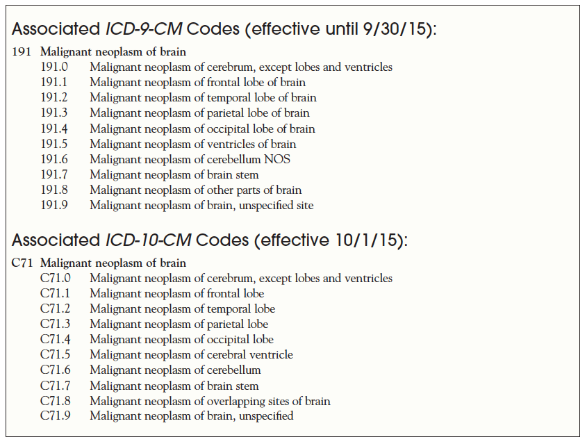 - Associated ICD-9-CM codes used for the classification of brain cancer