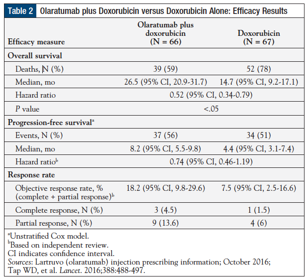 Treatment with olaratumab plus doxorubicin demonstrated a significant improvement in overall survival; patients who received the combination lived a median of 11.8 months longer than those who received doxorubicin alone (Table 2).