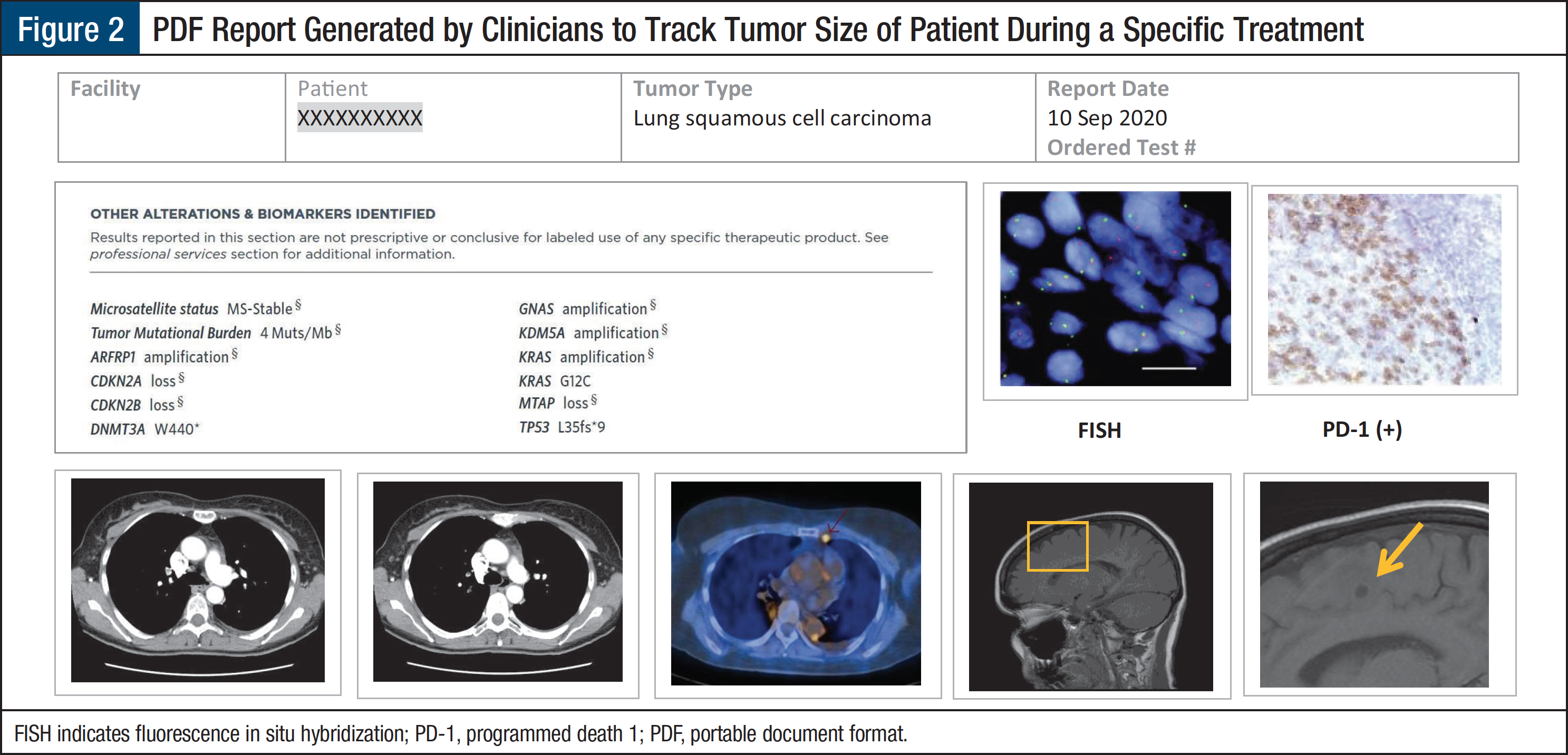 An integrated platform can provide insight into the number of genomic test results for each cancer type by stage of disease at diagnosis. The National Comprehensive Cancer Network (NCCN) guidelines recommend testing for EGFR mutations in patients with metastatic non–small-cell lung cancer (NSCLC) as well as in patients with early-stage NSCLC whose cancer is resectable.2 The dashboard can provide insight into clinician compliance with NCCN guidelines to optimize outcomes for their patients. Except for KRAS, which is a prognostic marker and predicts nonresponse to tyrosine kinase inhibitors in patients with EGFR mutations, the molecular genomic biomarkers identify patients who are eligible for targeted therapies (Figure 1). These types of results are of major interest to pharmaceutical researchers and payers.