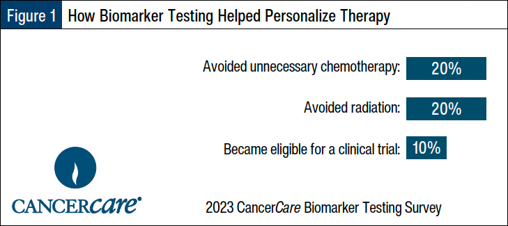 Biomarker testing is a necessary tool in the advancing world of precision cancer treatment. According to a new survey released by CancerCare, a leading national cancer support organization, bimarker testing helped physicians tailor therapy for nearly all the respondent patients (93%) whose cancers were tested over the past 3 years. Two in 10 (20%) patients with cancer surveyed were able to avoid unnecessary chemotherapy and/or radiation and 10% became eligible for a clinical trial (Figure 1).