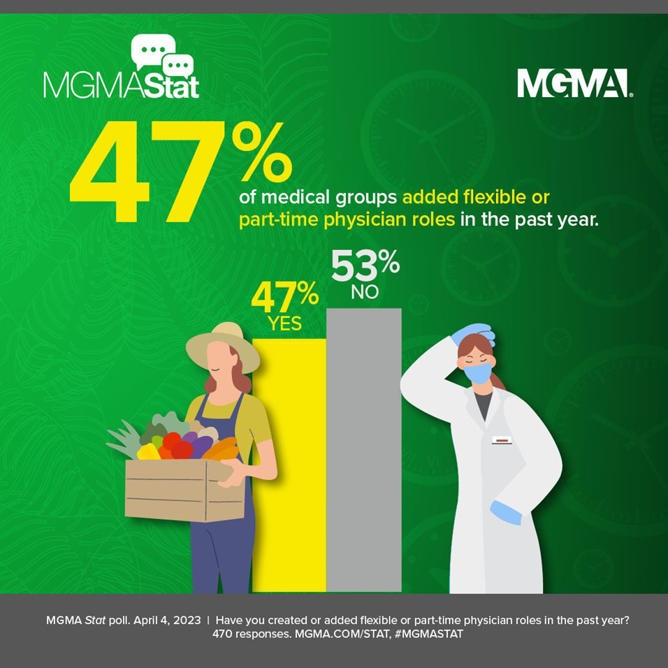 An April 4, 2023, Medical Group Management Association (MGMA) Stat poll found that almost one-half (47%) of medical group leaders have added or created part-time or flexible-schedule physician roles in the past year, while 53% did not (Figure). The poll had 470 applicable responses.