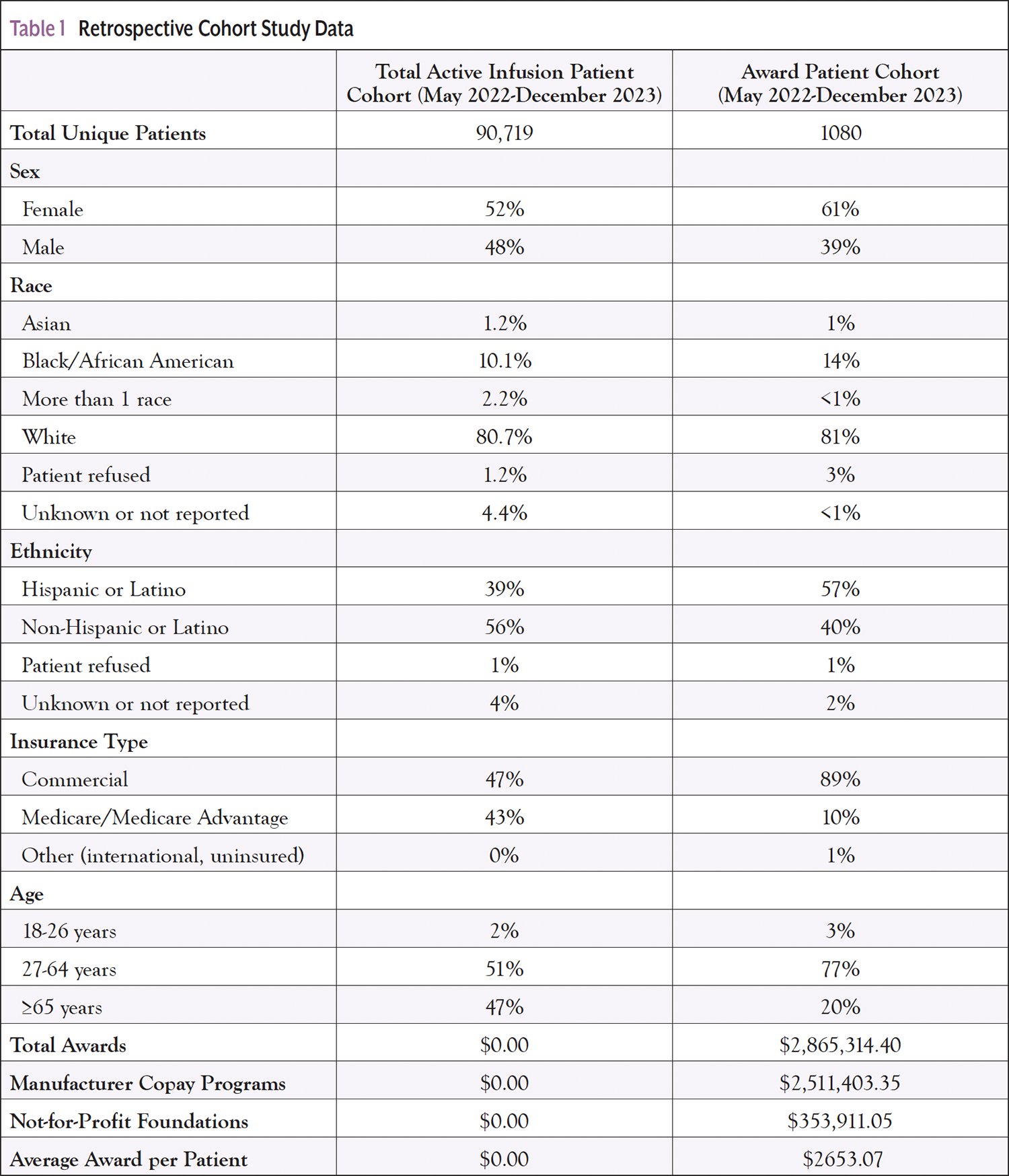 While the eligibility requirements vary, most programs require the individual to demonstrate personal responsibility by submitting documentation of paid claims to generate awards. Many programs allow retroactive requests for infusions up to 180 days before enrollment—each program’s eligibility links to a specific drug. Patients on regimens that include multiple high-cost drugs must enroll in several programs, making applying for and collecting awards very time intensive. Patients with state or federally funded health insurance must rely on charitable foundations for assistance, limiting the availability of funds. As a result, Medicare-insured patients aged ≥65 years were underrepresented in the AC.