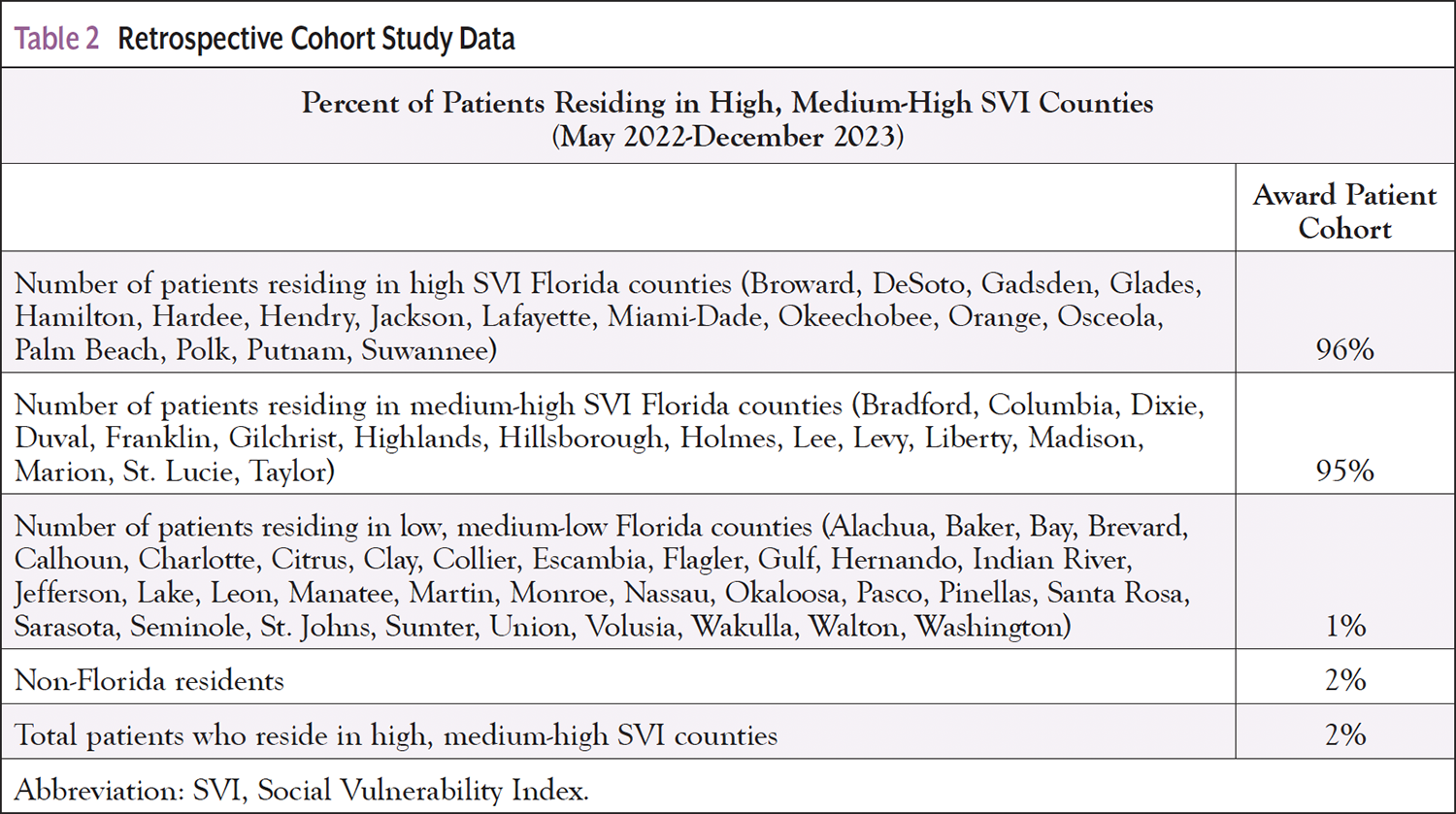 Social determinants of health (SDOH) have become increasingly important for achieving optimal cancer outcomes. The SVI is a key measure relating to SDOH, which can help identify populations at increased risk for poor health.11 The Agency for Toxic Substances and Disease Registry developed SVI using United States Census information to calculate SVI per county based on 4 key themes and 15 social factors, including socioeconomic status, household composition, disability, race/ethnicity, language, and housing or transportation status.11 A higher SVI score indicates greater social vulnerability linked to key barriers affecting overall wellness. The most socially vulnerable US counties have higher cancer mortality rates.12 Cancer patients in lower-income household groups are at high risk for financial toxicity.13 %FPL is used to identify patients’ socioeconomic status. Because %FPL was unavailable in the EHR, zip code/county data were used to determine the SVI score for the AC patient population (Table 2). The AC demonstrated that 96% of the patients resided in high, 1% in medium-high, and 2% in low and medium-low SVI counties; 2% of the AC represented non-Florida residents. Ninety-six percent of the patients who were matched as eligible for patient assistance programs represented the most vulnerable populations (Table 2; Figure).