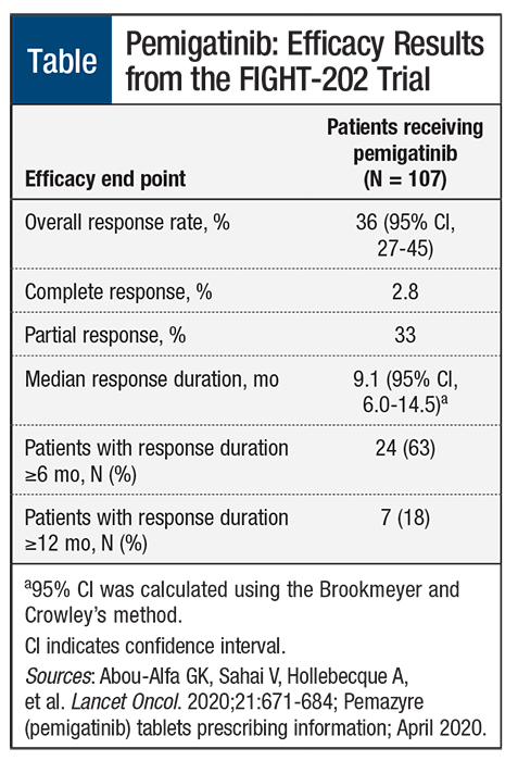 Patients who received pemigatinib monotherapy achieved an ORR of 36% and a median duration of response of 9.1 months (Table). Moreover, 63% of patients receiving pemigatinib had response to treatment lasting ≥6 months, and 18% had a response lasting ≥12 months. The median time to pemigatinib response was 2.7 months (range, 0.7-6.9 months).5