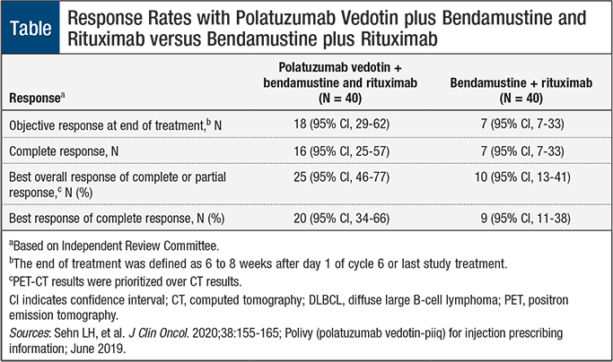 The accelerated approval of polatuzumab vedotin, in combination with bendamustine-rituximab, provides the first chemoimmunotherapy option for patients with relapsed or refractory DLBCL. In a clinical trial, patients who received polatuzumab vedotin plus bendamustine-rituximab had a significantly greater complete response rate and objective response rate, more than twice the response rate than patients who received only bendamustine-rituximab. Of patients who received polatuzumab vedotin plus bendamustine-rituximab and had a complete or partial response, 64% sustained the response for ≥6 months and 48% sustained the response for ≥12 months.