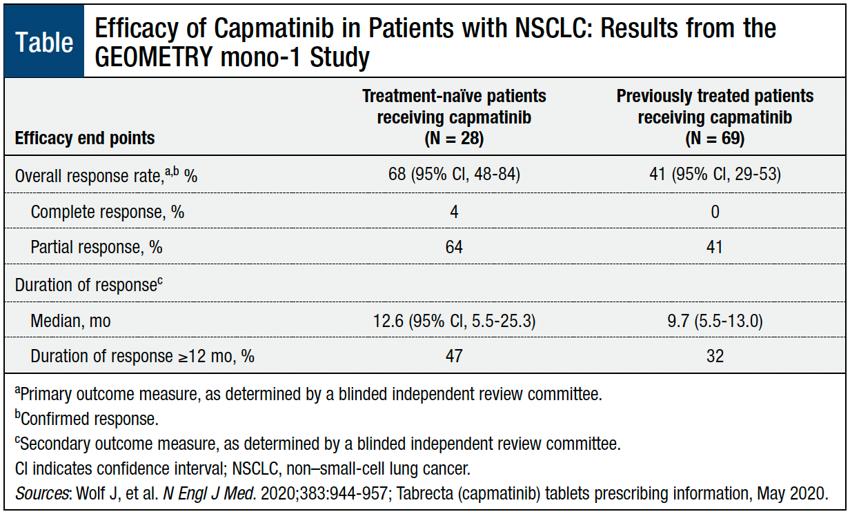 The overall response rate in patients who received capmatinib was 68% in treatment-naïve patients and 41% in previously treated patients (Table).6,11 Of patients who achieved a response, the median duration of response was 12.6 months in the treatment-naïve group and 9.7 months in the previously treated group.6,11