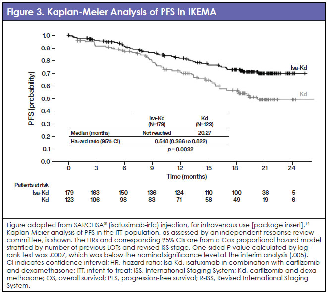 Moreover, updated PFS and depth-of-response data from the IKEMA trial were presented at the 8th COMy Congress, May 12-14, 2022, in Paris, France.36 At a median follow-up of 44 months, there was a significant PFS benefit with Isa-Kd compared with Kd (35.7 vs 19.2 months; HR, 0.58; 95% CI, 0.42-0.79) in patients with RRMM. PFS2 (defined as the time from randomization to disease progression on the next line of treatment or death), complete response (CR) rate, and the percentage of patients reaching minimal residual disease (MRD) also significantly favored Isa-Kd over Kd; these data support Isa-Kd as a standard-of-care treatment for patients with RRMM. Further details of these updated data will be presented in a future issue of Faculty Perspectives on The Evolving Clinical Impact of Isatuximab in Multiple Myeloma Management.