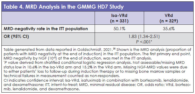 In addition to the ICARIA-MM and IKEMA studies, the quadruplet regimen of isatuximab in combination with bortezomib, lenalidomide, and dexamethasone (Isa-VRd) is being investigated in 2 ongoing phase 3 studies. The randomized, open-label, phase 3 IMROZ study (NCT03319667) is evaluating the clinical benefit of Isa-VRd, compared with VRd, in patients with transplant-ineligible newly diagnosed MM (NDMM).37 The ongoing phase 3 GMMG HD7 study (NCT03617731) is evaluating the efficacy of induction therapy with Isa-VRd followed by isatuximab plus lenalidomide maintenance, compared with induction with VRd and lenalidomide-only maintenance, in transplant-eligible patients with NDMM.38 Data presented at the 2021 American Society of Hematology Annual Meeting & Exposition showed that the study met its primary end point, MRD negativity, as assessed by next-generation flow (NGF), after induction therapy; MRD negativity rates after induction were 35.6% and 50.1% (odds ratio [OR], 1.83; 95% CI, 1.34-2.51; P <.001) for VRd and Isa-VRd, respectively (Table 4).38 Multivariate analyses including treatment arm, Revised International Staging System (R-ISS), performance status, renal impairment, and age and sex indicated that treatment with Isa-VRd, compared with VRd, was the only significant predictor for increased MRD negativity after induction (OR, 1.82; 95% CI, 1.33-2.49; P <.001). The MRD negativity benefit at the end of induction was observed across all subgroups, including patients with renal impairment, high-risk cytogenetics, World Health Organization performance status, and R-ISS stage.38 Based on these data, Isa-VRd is the first regimen to demonstrate a rapid and statistically significant benefit from treatment by reaching a MRD negativity of 50.1% at the end of induction and to show superiority over VRd in a phase 3 trial.38