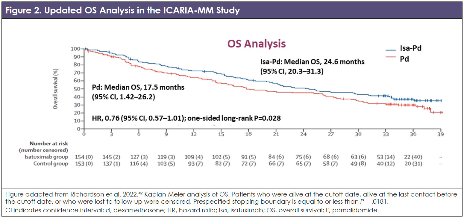 - Richardson PG, Perrot A, San-Miguel J, et al. Isatuximab plus pomalidomide and low-dose dexamethasone versus pomalidomide and low-dose dexamethasone in patients with relapsed and refractory multiple myeloma (ICARIA-MM): follow-up analysis of a randomised, phase 3 study. Lancet Oncol. 2022;23:416-427.
