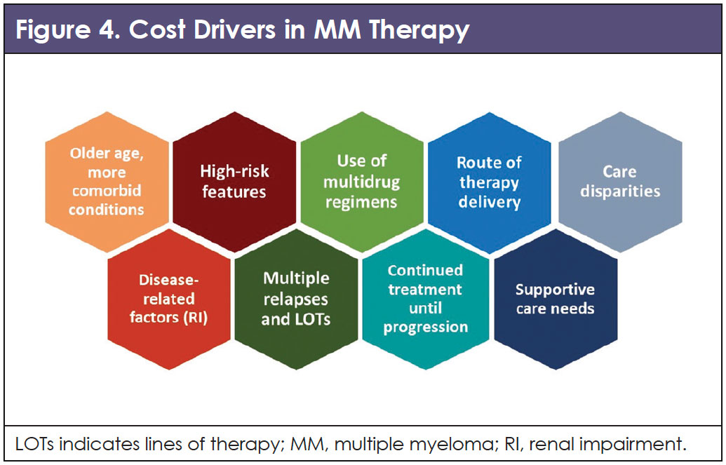 In addition to the clinical challenges associated with managing MM, the financial toxicity associated with MM care has been recognized as a significant barrier to care and to optimizing clinical and pharmacoeconomic outcomes for patients with MM.10-17 Given the rapid and continued expansion of available treatments and the complexity of optimizing treatments, maintaining clinical benefits while addressing the high costs of the MM therapy are increasingly important.18