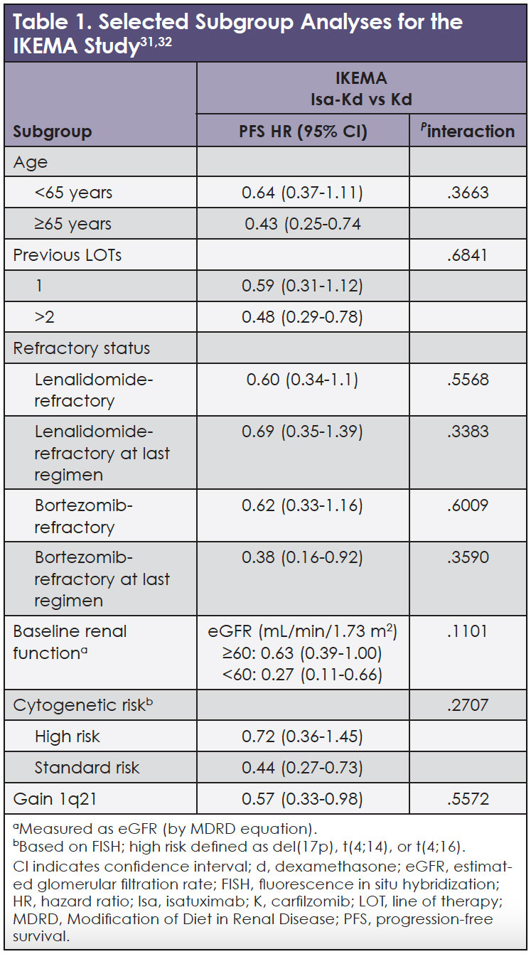 Subgroup analyses of data from the IKEMA study demonstrated superior clinical benefit of Isa-Kd over Kd alone across subgroups, including patients of various age groups (≥65 years vs <65 years), with renal impairment (RI), with gain/amplification of 1q21 (referred to hereafter as 1q21+), with high-risk cytogenetics, with ≥1 previous LOTs, and with refractory status (lenalidomide- or bortezomib-refractory) (summarized in Table 1).24,28-31