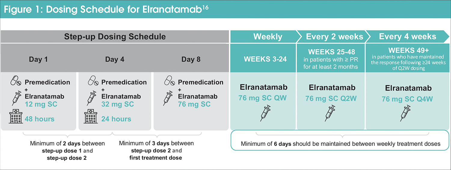 Although the bispecific antibodies have demonstrated meaningful clinical efficacy in RRMM, their use is associated with unique challenges that require careful consideration. Distinct toxicities, including cytokine release syndrome (CRS), infections, neurotoxicity, and cytopenias, have been consistently reported.5 Beyond safety concerns, outpatient administration of bispecific antibodies introduces logistical complexities, particularly during the first 2 step-up doses, which require early recognition and management of AEs.14 Healthcare teams must be adequately trained to identify symptoms of CRS and other toxicities early, and patients need clear guidance on when and how to seek medical attention. In this context, understanding the clinical profile of elranatamab, including its efficacy, safety considerations, and practical aspects of administration, is critical for integrating AE management, optimizing operational workflows, and ensuring continuous QI approaches to improve patient outcomes.