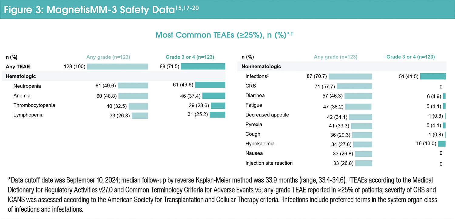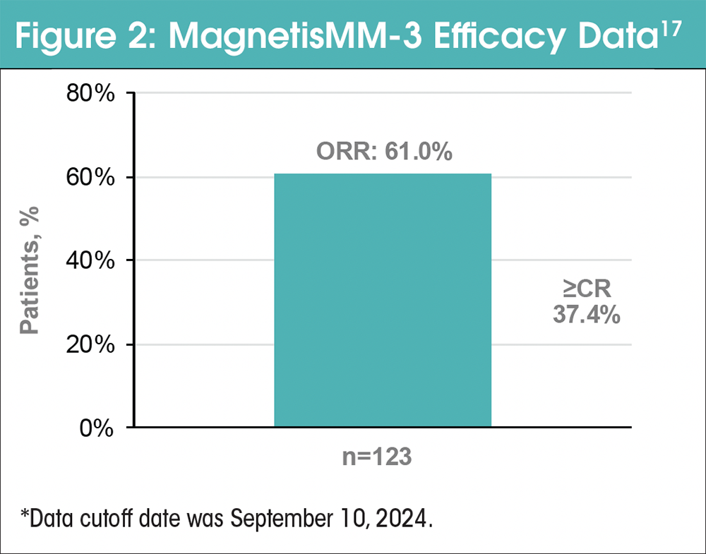 The primary endpoint of the MagnetisMM-3 study was overall response rate (ORR). Among BCMA-naïve patients, after a median follow-up of 33.9 months, a clinically meaningful improvement was observed; the ORR was 61.0% with 37.4% of patients achieving a complete response or better (Figure 2).