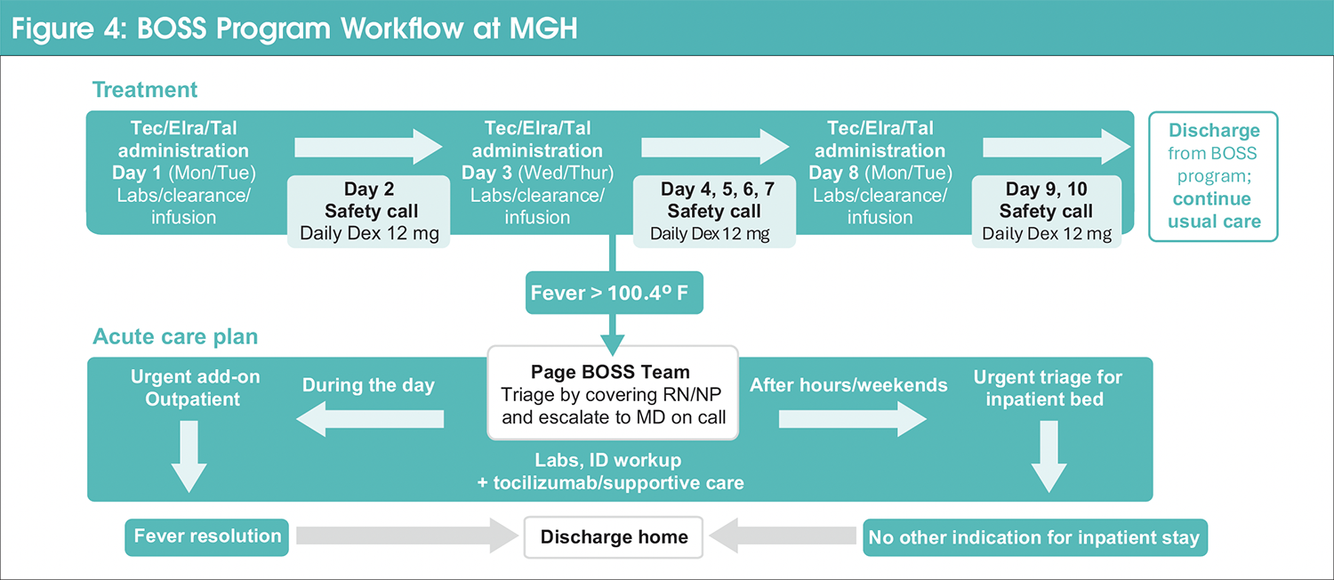 Toxicity management and monitoring are key parts of cancer care and these processes should be fit for purpose for the institution. At MGH, CRS prophylaxis strategies for elranatamab were adapted specifically for outpatient settings. They developed a practical and scalable approach to CRS prophylaxis, prioritizing outpatient care using dexamethasone over tocilizumab. While tocilizumab required significant logistical resources, including infusion clinic availability and trained staff, dexamethasone offered a more accessible and resource-efficient alternative, especially for community and rural settings. Informed by institutional data, input from other centers, and extensive experience with elranatamab during MagnetisMM trials, MGH incorporated dexamethasone into its BOSS program. A clear escalation protocol was implemented to manage toxicity, ensuring patients and providers understand the steps for addressing symptoms like CRS. Consistent symptom workups, such as fever evaluations, were standardized across providers to ensure comprehensive care and accurate data collection.