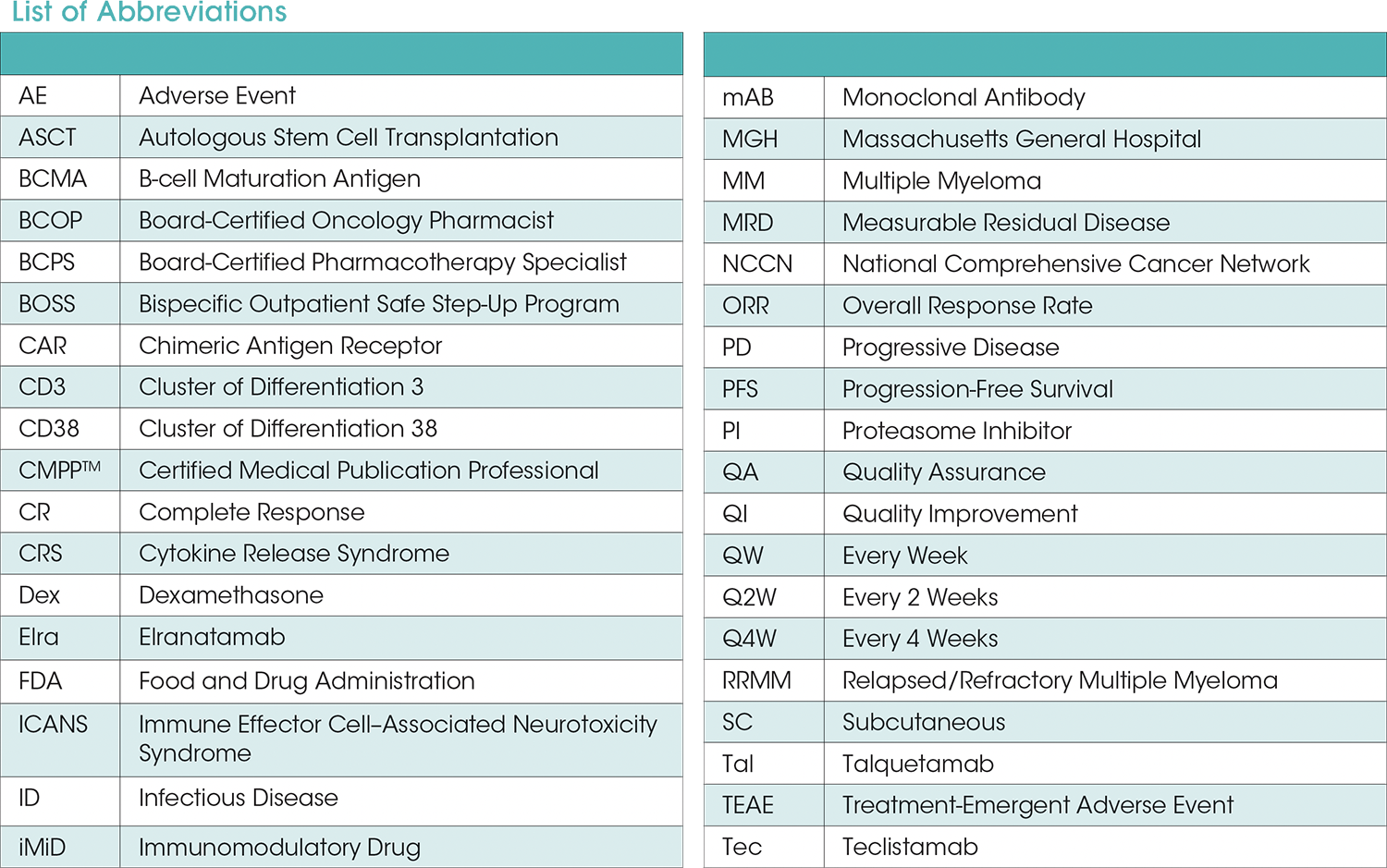 Elranatamab is an important and efficacious therapeutic advance for patients with RRMM, particularly those with limited treatment options. However, the complex dosing and AE profile require optimal patient monitoring and care when implementing into clinical practice, paving the way for continuous improvement initiatives. The QI/QA initiatives at MGH are a model example for what factors should be considered when starting to implement elranatamab into clinical practice, particularly in outpatient administration. The BOSS program, through their efforts, observed reductions in CRS rates and CRS-related complications.21 The results from MGH’s initiatives demonstrate the value of combining novel therapies with QI and QA frameworks to ensure safe care, optimize outcomes, and establish scalable models for delivering complex oncology treatments.